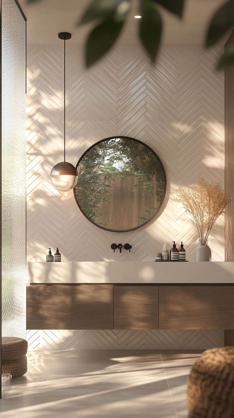 This bathroom has a beautiful herringbone tile floor and a modern design. With a big round mirror, dark fixtures, and a touch of wood, it feels cozy and stylish.
