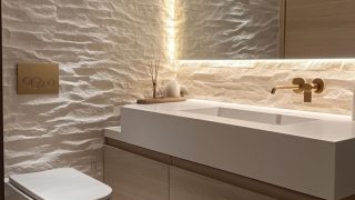 This bathroom has soft, neutral walls with a modern design. It features a floating vanity, a big mirror, and soft lighting, creating a calm and stylish space with a touch of greenery.