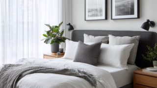 Grey furniture and textiles give the bedroom a soft, neutral palette. It’s a versatile choice that feels elegant without overwhelming.