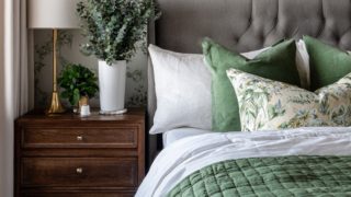 A black-framed mirror brings contrast and boldness to a bedroom. It anchors the design and ties together darker accents.