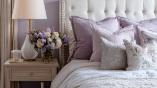 Purple tones infuse a dark bedroom with a regal and dramatic feel. Rich hues and luxurious fabrics make the space feel bold and sophisticated.