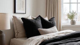 A black bedroom feels bold and dramatic, especially when softened with velvet fabrics and golden lighting. The monochrome palette adds intensity and intimacy.