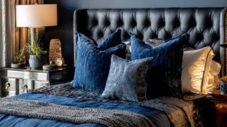 Layered fabrics and soft lighting define the cozy warmth of this bedroom. The design feels restful and perfect for unwinding.