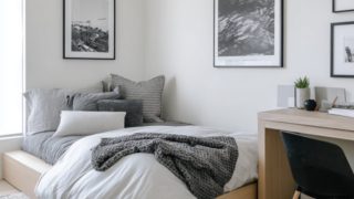 A modern bedroom emphasizes clean lines and simple furniture in neutral tones. Pops of color through decor or bedding keep the room youthful and lively.