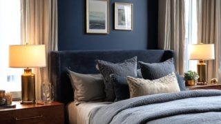 A dark blue bedroom feels cozy and bold with deep navy walls and contrasting light bedding. Simple decor pieces keep the space from feeling too heavy.